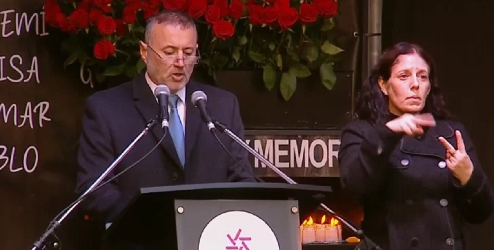El titular de la mutual israelita, Osvaldo Armoza, fue el principal orador del acto que se realizó para recordar a las víctimas del ataque terrorista. El presidente Javier Milei estuvo presente junto a integrantes de su gabinete.