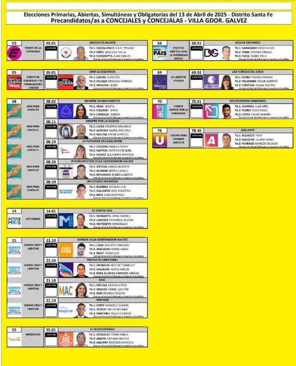 Elecciones Legislativas en Villa Gdor. Gálvez. Boleta única para precandidatos a concejales y listas.