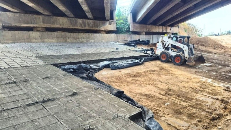 La obra está dividida en dos grandes etapas. La primera, centrada en el refuerzo estructural del puente, ya tiene un avance del 90%. Incluye la reconstrucción de la losa de fondo y la colocación de mantas de hormigón adheridas a geotextiles para proteger los extremos del puente.