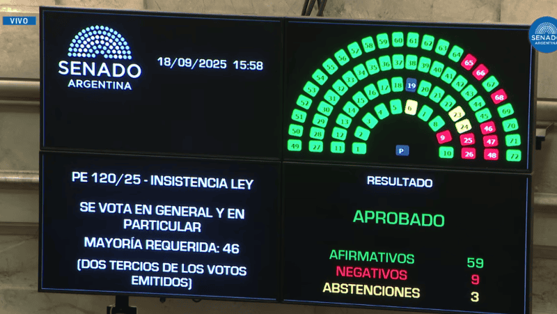 El resultado implicó otro duro revés para el Gobierno con 59 votos contra el veto (necesitaba dos tercios), solo nueve oficialistas que respaldaron al Ejecutivo y tres abstenciones.