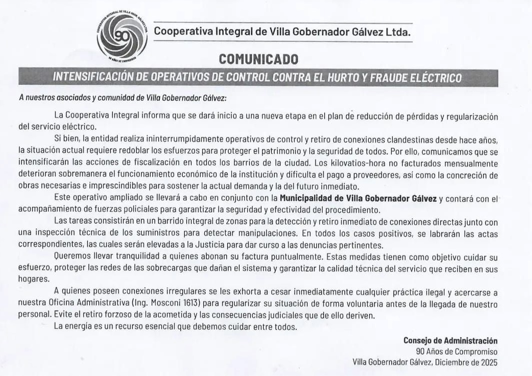 La Cooperativa Integral cierra un 2025 con algunas dificultades por el hurto de energía pero que a través del diálogo, irán trabajando en el control y concientización a partir de este nuevo año 2026 para lo cual emitió un comunicado y lo hará en conjunto con la Municipalidad.