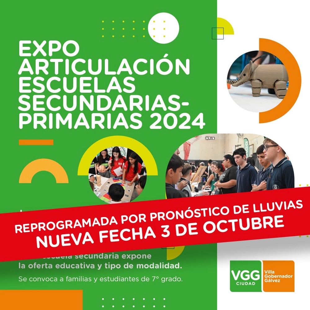 La Municipalidad de Villa Gobernador Gálvez informa que, por pronóstico de lluvias, la “Expo articulación escuelas secundarias-primarias” será reprogramada para el jueves 3 de octubre.